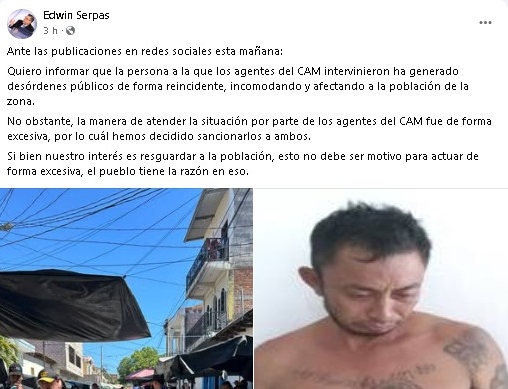 “Quiero informar que a la persona que agentes del CAM intervinieron ha generado desórdenes públicos de forma reincidente, incomodando y afectando a la población de la zona. No obstante, la manera de atender la situación por parte del CAM, fue de forma excesiva por lo cual hemos decidido sancionar a ambos” añadió Serpas.